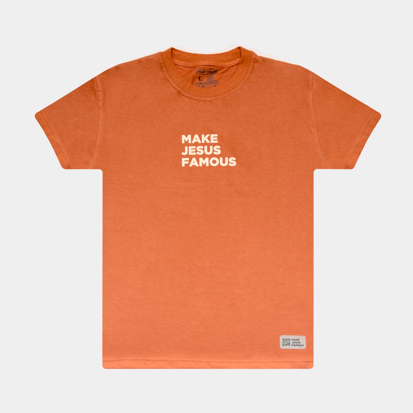 This tee features our MJF logo and slogan on the back in a cream color. Our MJF-branded embroidered tag has a QR code for scanning capabilities. Printed on our premium heavyweight Streetstyle tee; quality fabric and care for your faith.