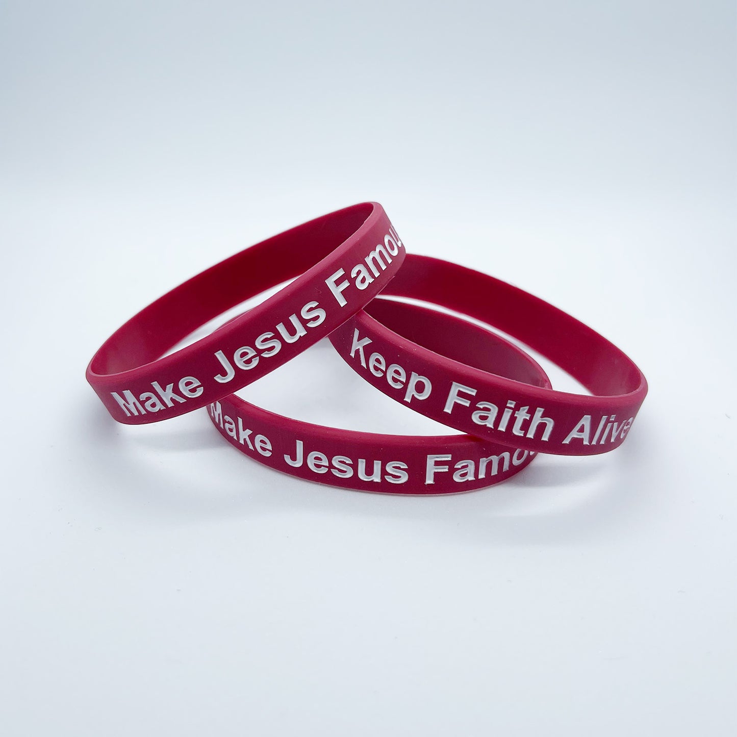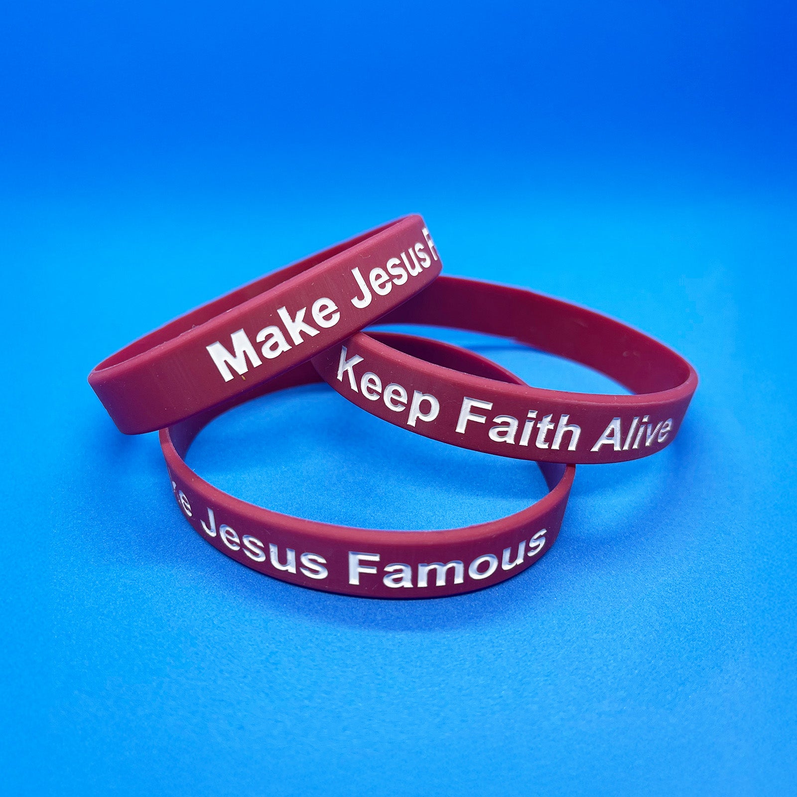 This maroon silicone wristband features the powerful phrases “Make Jesus Famous” and “Keep Faith Alive”—a daily reminder to walk boldly in your faith. Whether you’re at school, work, or an event, or just out with friends, this wristband starts conversations and shares the message of Jesus in a simple, meaningful way.