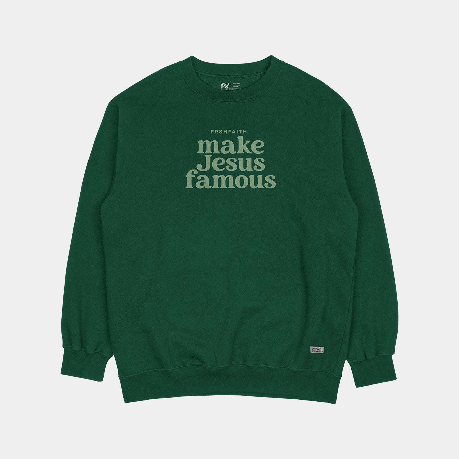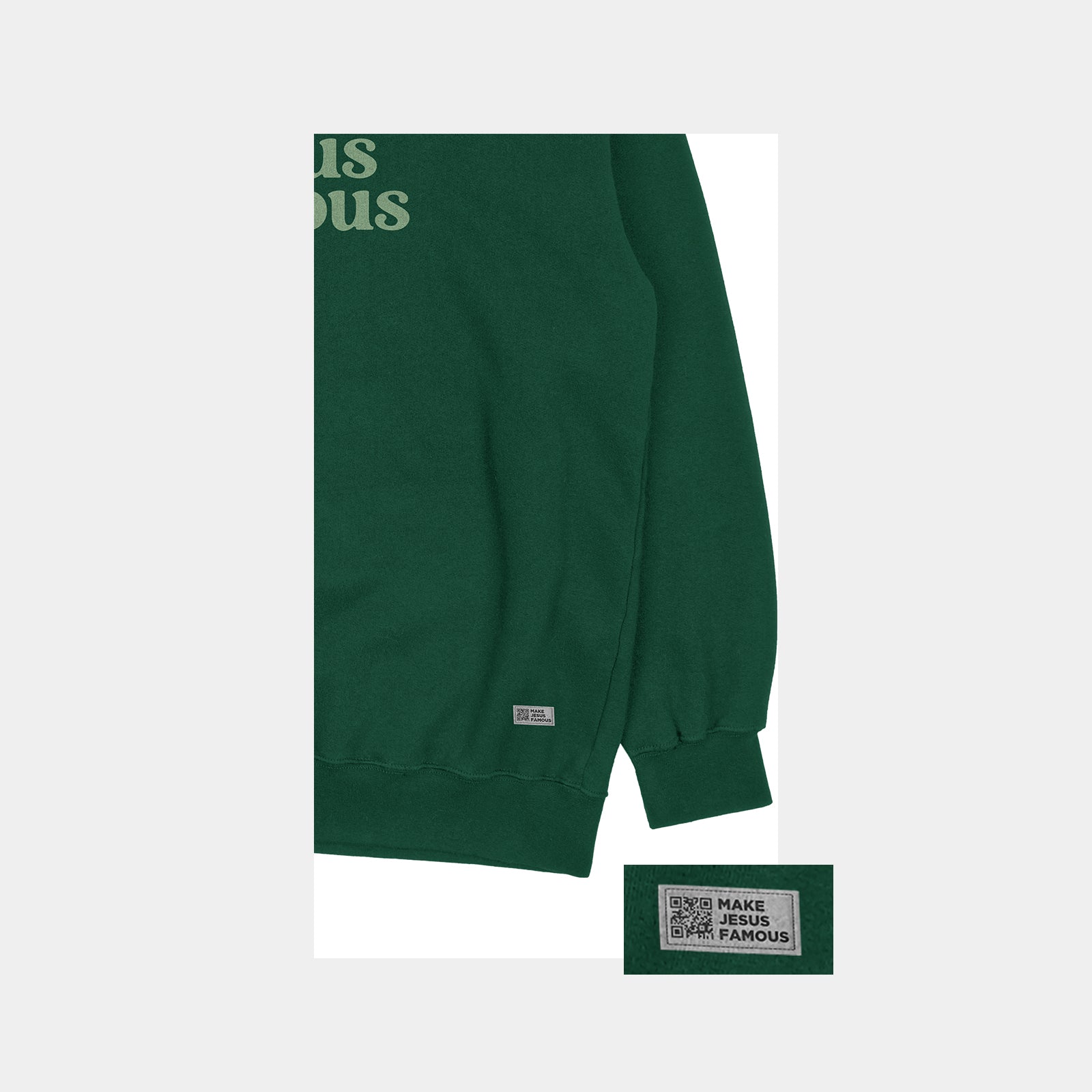 This deep forest green crewneck features an eye-catching Make Jesus Famous avocado-colored front print. Designed to empower your faith with confidence and love—it's a fresh take on spreading the gospel.