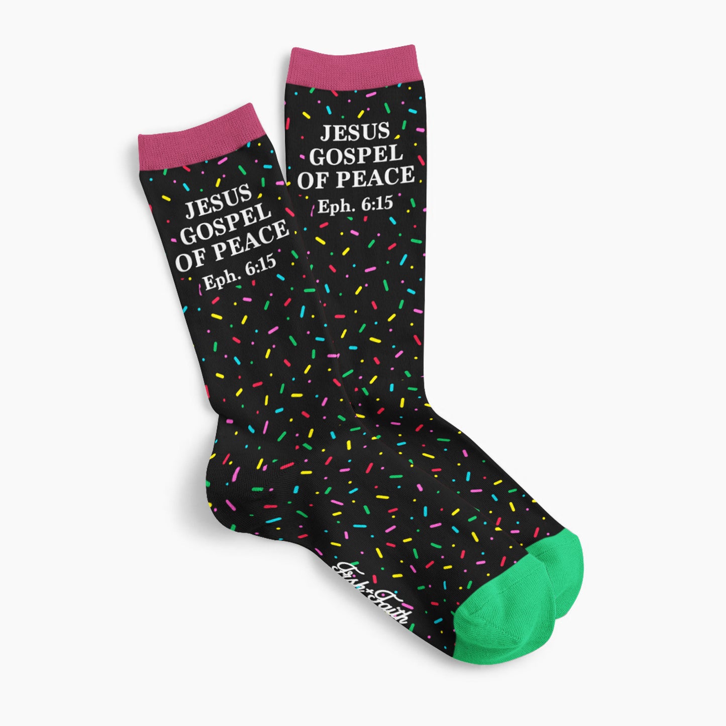 In reference to putting on God's whole armor. The Jesus Gospel of Peace color speckled crew 🧦 sock is a great reminder to yourself and others that your peace comes from Jesus Christ. Give the good news of the gospel to someone who needs to hear it, and share why Christ is your peace.